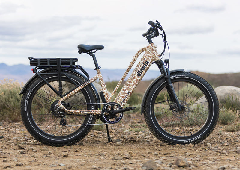 The Dirwin Pioneer Plus Hunting Electric Bike is a UL certified, all-terrain ebike with a 750W/1000W peak motor and dual battery system that provides a range of up to 90 miles. It features a unique Torque & Cadence sensor to provide an optimal riding experience on both flat and steep terrain. Tektro hydraulic disc brakes, 26” x 4.0” puncture-proof Kenda tires, and a hydraulic suspension fork make all-terrain riding a breeze. With a load capacity of over 350 lbs, and a maximum speed of 28 MPH, this bike can handle anything that you can throw at it.